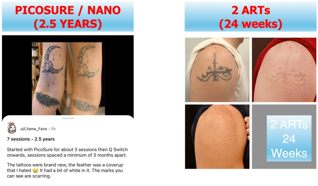 So why aren’t sub-nano second lasers removing tattoos in many fewer sessions (passes) or in less time? Why is ART so much faster?
